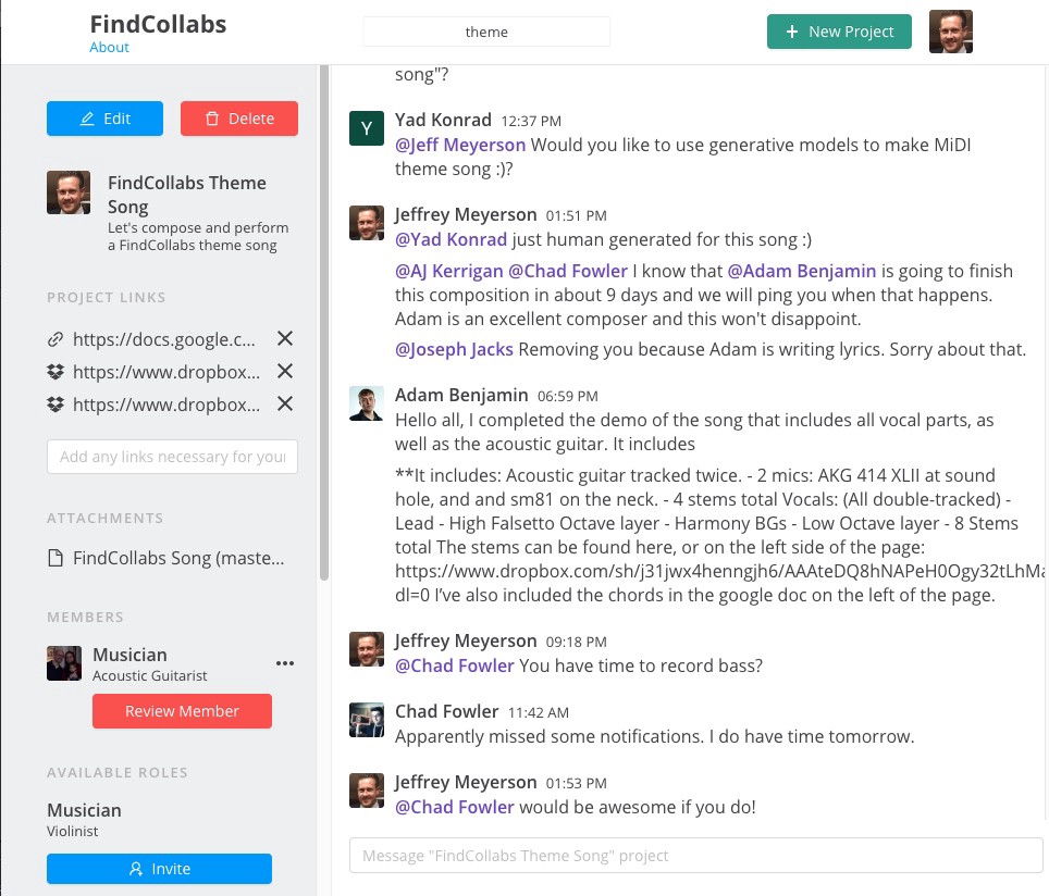One project I’m working on is a FindCollabs Theme Song. Two collaborators have worked on the project, Adam and AJ. I already gave Adam a review (he did a great job). AJ’s review is pending.