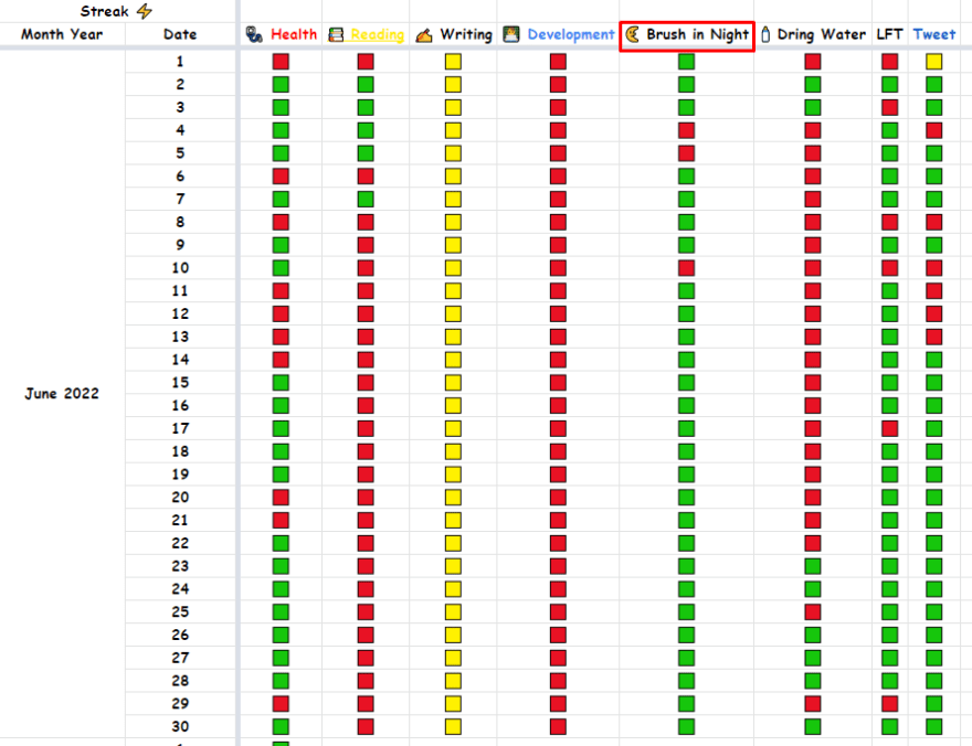 Here you can see, that I am not consistent at everything, but this color full graph really motivates me. (I am tracking my habit on google sheets right now, but I am planning to move it to Notion.)