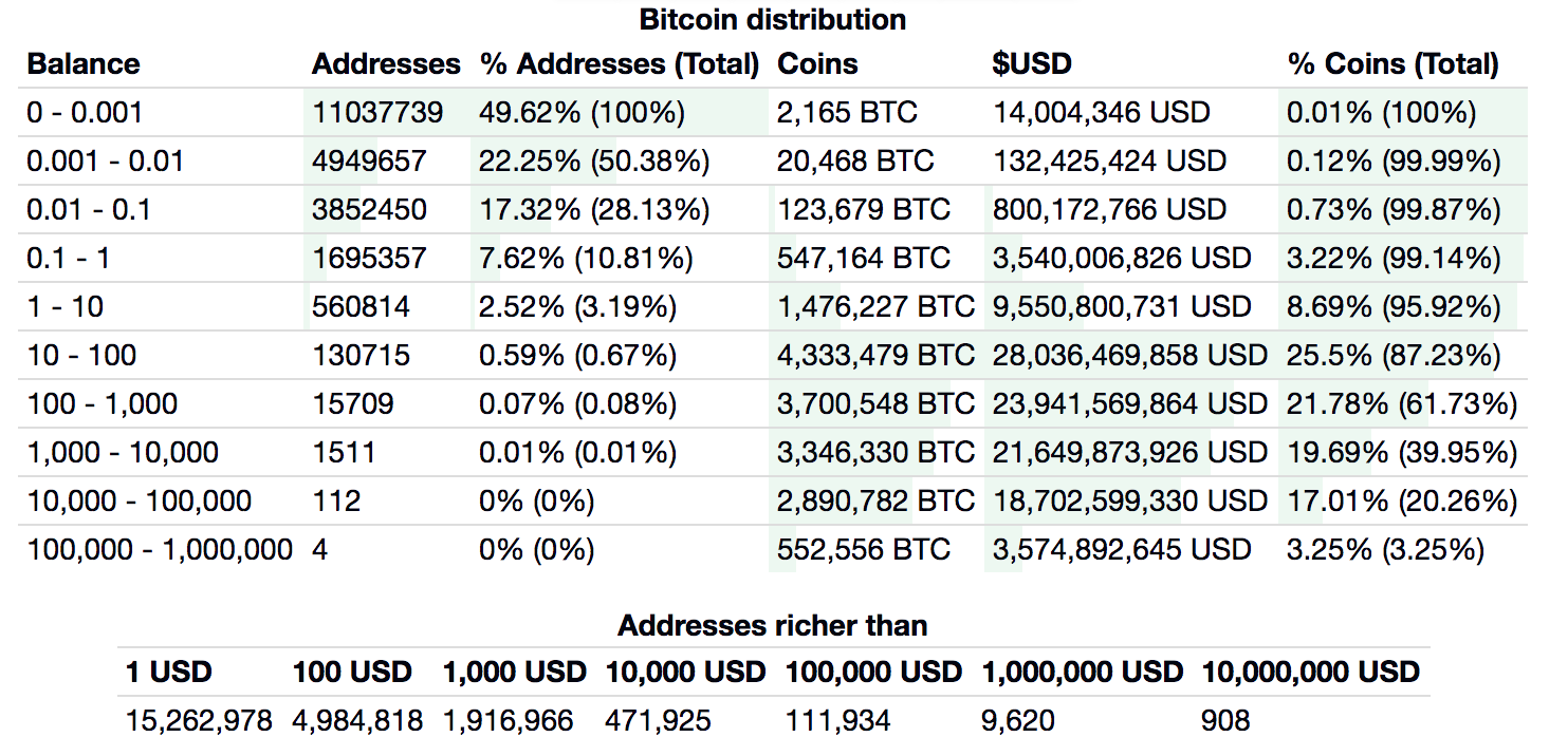 The concentration of Bitcoin wealth is evidenced by the coin’s distribution across addresses: 99.14% of Bitcoin is held by 10% of the addresses. It is oft remarked that Bitcoin has Gini coefficient (~0.88) consistent with some of the countries with the most skewed wealth distributions. The same of course could be said for the shareholder bases of some of the most celebrated technology giants… but unlike countries and companies, Bitcoin is of course an instrument not of centralized control, but of decentralized protocol — that is indeed the point! While Gini might be theoretically useful to predict social unrest or shareholder revolts, the premise does not hold for a distributed system such as Bitcoin. Indeed, Bitcoin is for the world.