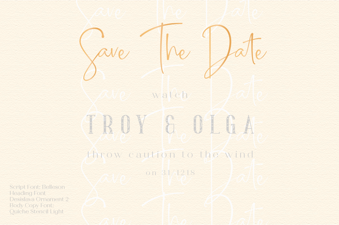 Just look how pretty the Desislava font is. You can switch it with the Script font and you will have another great variety. Keeping it simple with a serif stencil font, we have a fool-proof wedding font set.
