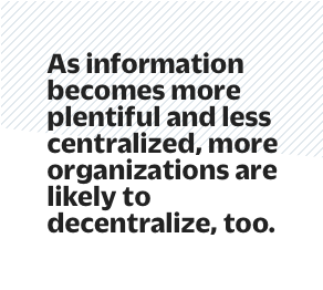 These technological transformations will continue to reshape the way the business world is organized. As information becomes more plentiful and less centralized, more organizations are likely to decentralize, too, in order to respond swiftly to it all.