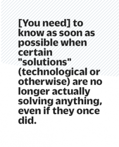 Sometimes end users change their minds. Sometimes they balk at anything new that is imposed on them. Sometimes techies fall in love with new technology for its own sake. Sometimes they are never asked what new technology is available that might improve a business process. Little wonder that so many technology projects fail! The only way around this is to constantly test the basic beliefs that undergird your company’s choices — to know as soon as possible when certain “solutions” (technological or otherwise) are no longer actually solving anything, even if they once did.