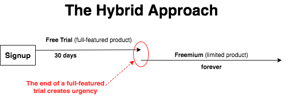 It’s not always about either or. I’m convinced that a hybrid approach between freemium and free trial can be an effective way to get the best of both options. Freemium can drive more demand but what if your company can’t provide all features because of the high cost to service free customers? Offering a full-featured free trial to select users can be an effective way to get the best of both worlds. Specifically, you can drive higher signups associated with the freemium model and a create sense of urgency due to a clear expiration date.