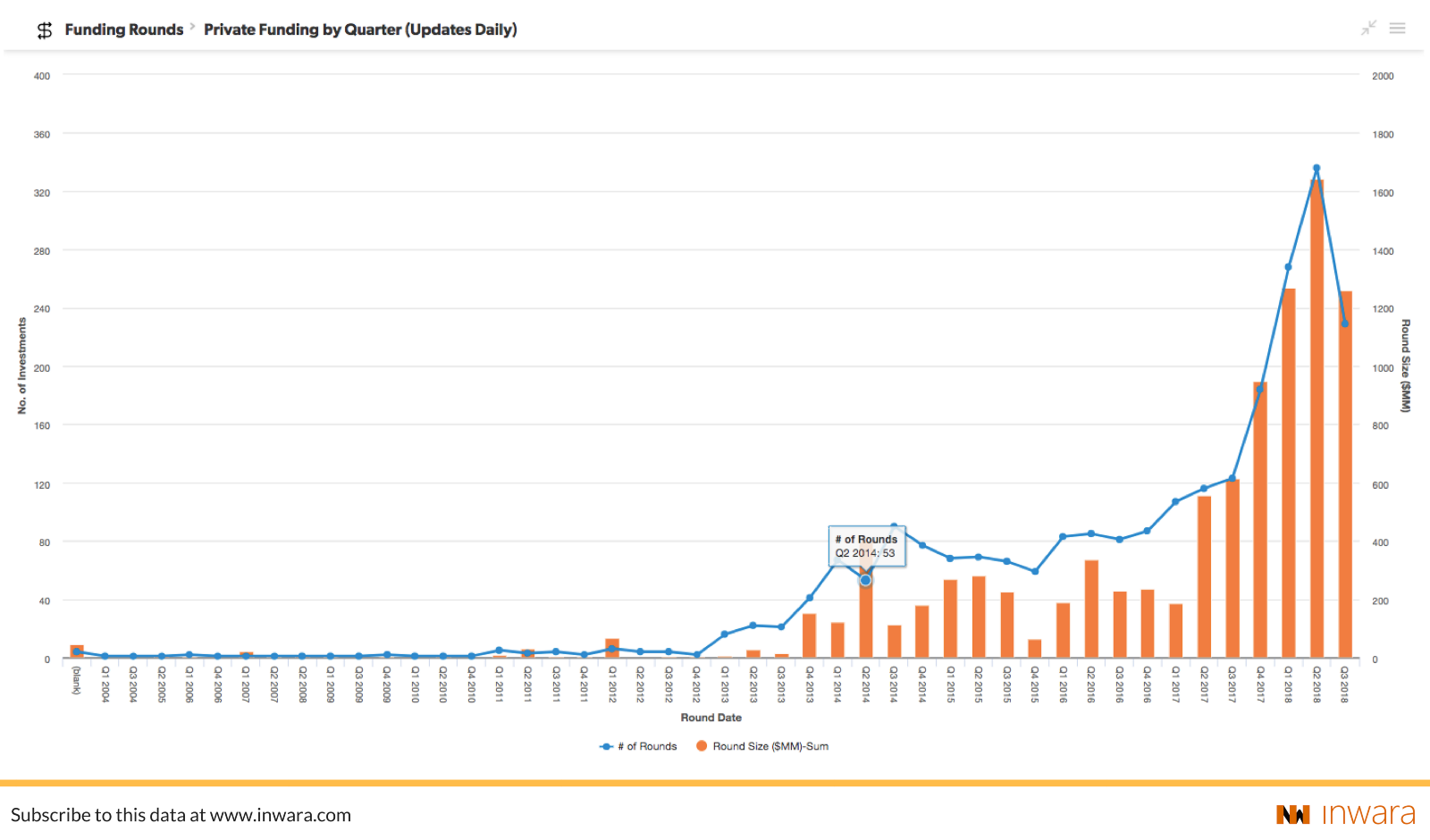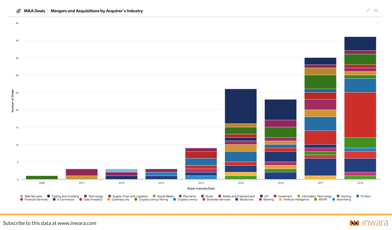 Private investments are difficult to measure since they are carried out with a certain degree of confidentiality. Extensive measures need to be taken to capture this information. InWara does this by analyzing 3000+ ICO whitepapers, almost 2200 official company blog articles, 500 official press releases and continuous web monitoring of news and social media sources.