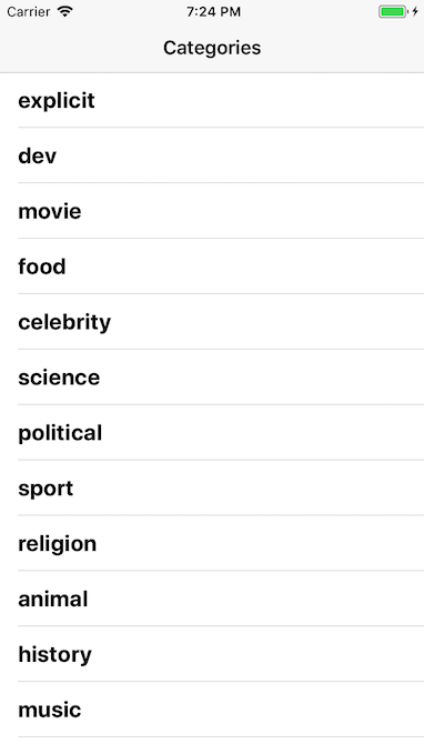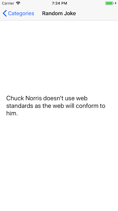 The app is about jokes about Chuck Norris, retrieved from this API. The first screen shows a list with joke categories. When user taps on one category, a new screen appears with a random joke of that category. We can see some screenshots (disclaimer: I didn’t put any effort on the UI):