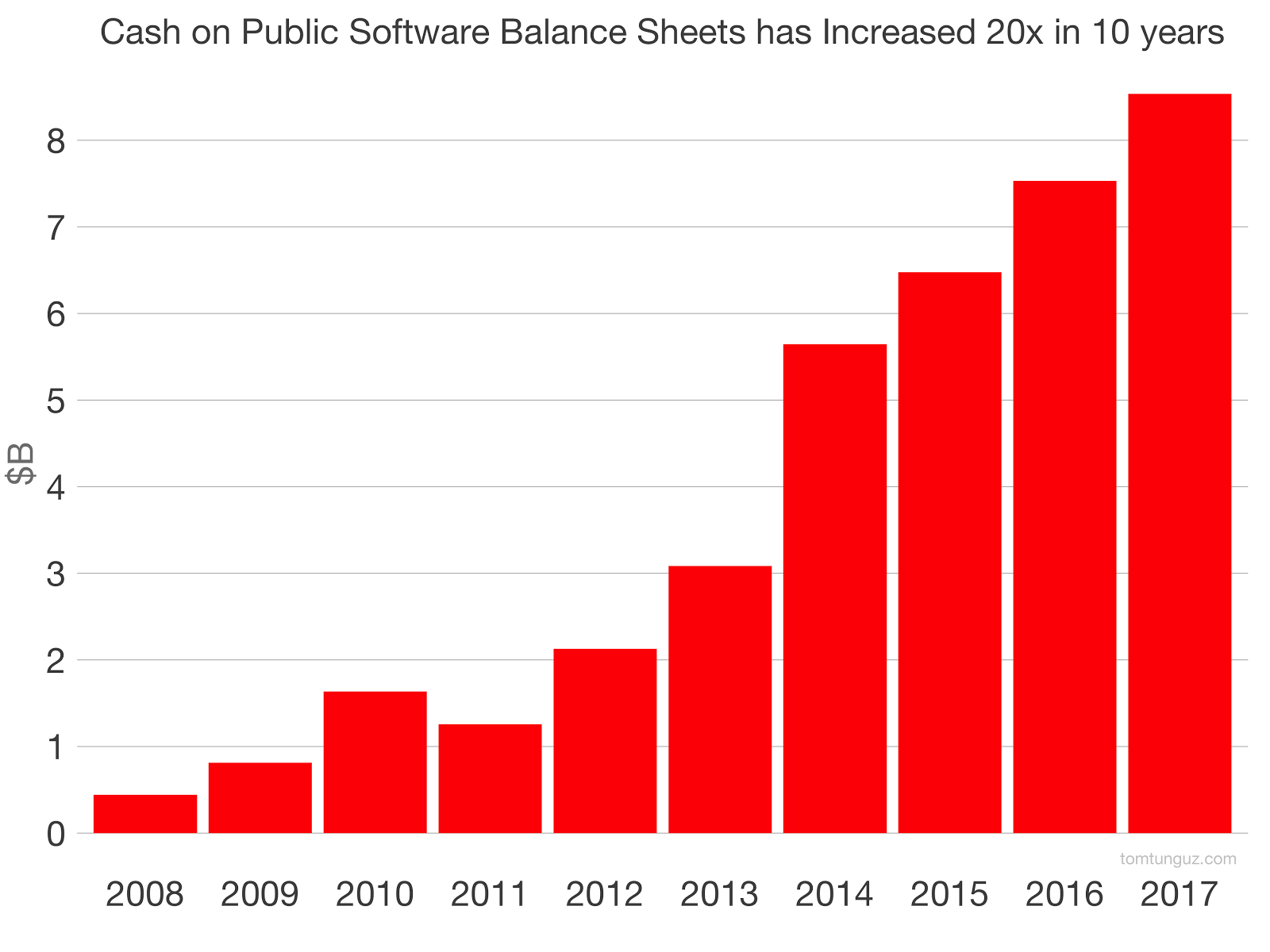 - Publicly traded tech companies (not including Google/Amazon/MSFT/Facebook) have grown their cash reserves by 20X over the last ten years and haven’t been too acquisitive with that dough. As of Q3 2017 the combined balance came to $8.5B.