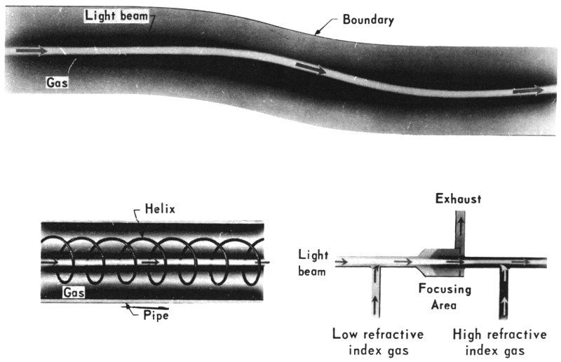 Scientists are experimenting with a new kind of “lens”, one that uses variations in the density of gases to focus and guide the beam automatically. Since there are no surfaces in the path of the light beam, and since the gas is transparent and free of turbulence, the laser beam is not appreciably weakened or scattered as it travels through the pipe.