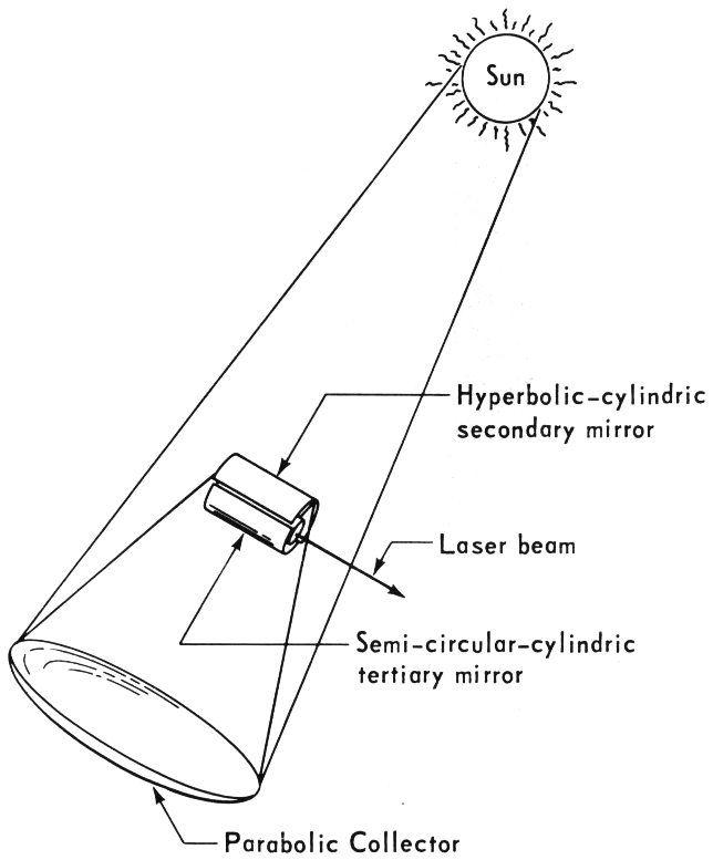 Figure 32 Artist’s rendering of sun-pumped laser as it would operate in space. The sun’s rays are collected by a parabolic reflector and are focused on the laser’s surface by two cylindrical mirrors.