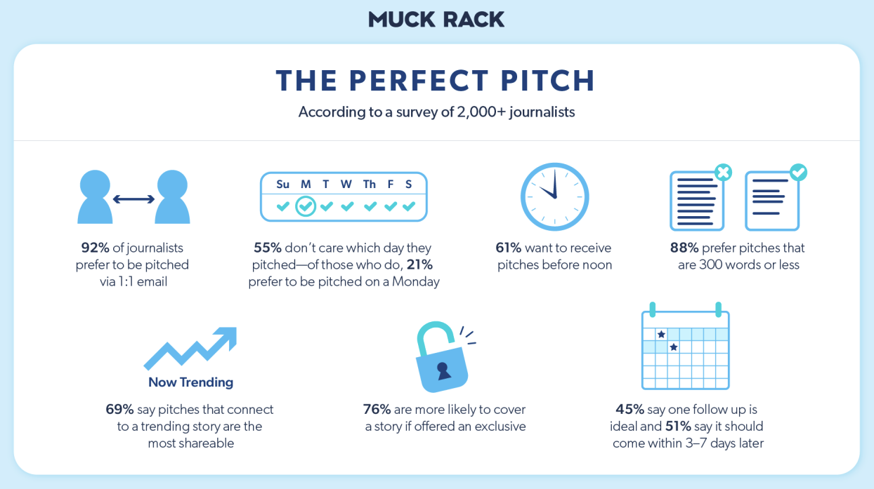 - Pitches should be sent via 1:1 email before noon, 300 words or less, offered as an exclusive or connected to a trend story, and followed up on within 3-7 days