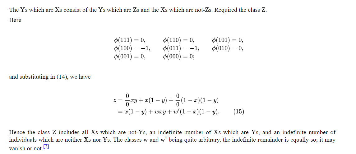 the coefficients of which we shall still term the moduli. The law of their formation will readily be seen, so that the general theorems which have been given for the solution of elective equations of two and three symbols, may be regarded as examples of a more general theorem applicable to all elective equations whatever. In applying these results it is to be observed, that if a modulus assume the form 0/0 it is to be replaced by an arbitrary elective symbol w, and that if a modulus assume any numerical value except 0 or 1, the constituent of which it is a factor must be separately equated to 0. Although these conditions are deduced solely from the laws to which the symbols are obedient, and without any reference to interpretation, they nevertheless render the solution of every equation interpretable in logic. To such formulae also every question upon the relations of classes may be referred. One or two very simple illustrations may suffice[6].