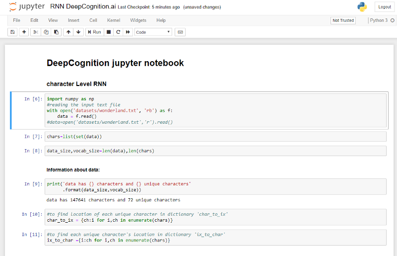 RNNs are computationally very expensive. To train our program I used Deep Cognition’s Deep Learning Studio. It provides preinstalled DeepLearning Frameworks such as Tensorflow-gpu/cpu, keras-gpu/cpu, pytorch…and many more. Check it out here.