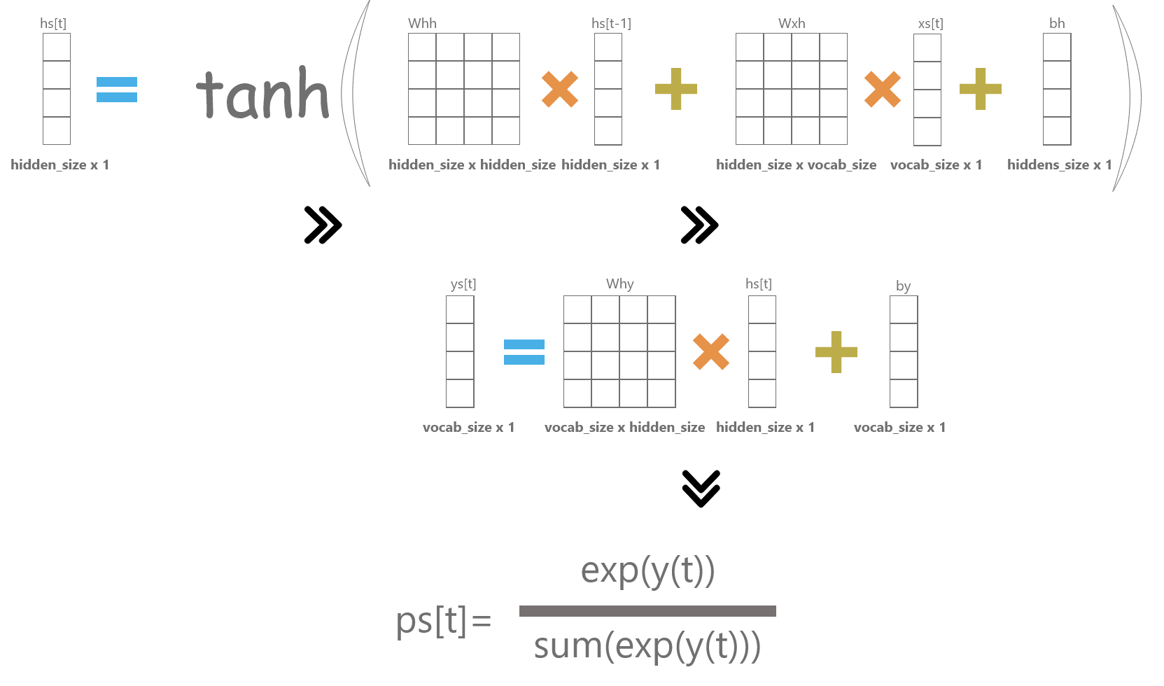 bh(not in the photo): randomly initialized column matrix as bias matrix to be added in calculation of h(t).