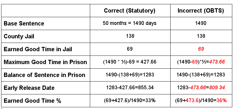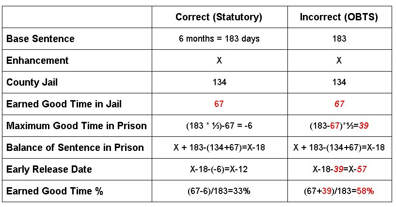 On 3 July 2002, the Washington state Supreme Court ruled In Personal Restraint of King that DOC must reduce base sentences by crediting inmates for “good time” earned while still in county jail and not treat the county jail time as part of the enhanced sentence. Prior to this verdict, DOC credited offenders only for the good time they earned while in prison. The King decision instructed DOC to begin running the enhancement “clock” on the day the offender was transferred to State custody, applying the time in local custody against the criminal’s base sentence. The court had suggested a simple 2-phase formula in which the enhancement or mandatory minimum sentence “clock” starts first and is allowed to complete without interference of credits and other factors; in the second phase, the inmate would serve the base portion of the sentence, and the formula would adjust this “clock” by the earned good time credits and time spent in pre-sentence detention. Unfortunately, the DOC did not use such a straightforward formula; instead, it mis-interpreted the court ruling, hatched its own complex calculation methods, and continued its practice of sequencing the offender’s enhancement period before the offender’s base period and somehow still credited the amount of jail time served against the enhancement. It also began crediting any jail good time earned to the base sentence before calculating prison good time. At the time of King decision, DOC used its legacy mainframe-based Offender Based Tracking system (OBTS), and in March 2003, DOC reprogrammed OBTS based on incorrect Requirements and formula in the original work request submitted by Janice McMann, then the DOC Records Manager. This OBTS defect was also migrated to the new web-based OMNI system. The illustrative sentencing calculation example below come from the Westinghouse-Blackstone Investigation Report.