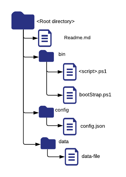 At the very basic it is recommended, that a standard directory structure is developed to package these development components. The root directory should contain Readme.md with specific details about how the packaging has been done, various scripts available and specific examples to run the script. The bin directory contains the various scripts along with a common bootStrap.ps1 which provides a standard mechanism to handle configuration, load common modules, initialize logging, handle common parameters (see below for more details). The config directory contains the configuration file with default values and the data folder contains various templates and other files needed to run the script. Additional directory like logs, tmp may be created as needed by script as part of the execution process.