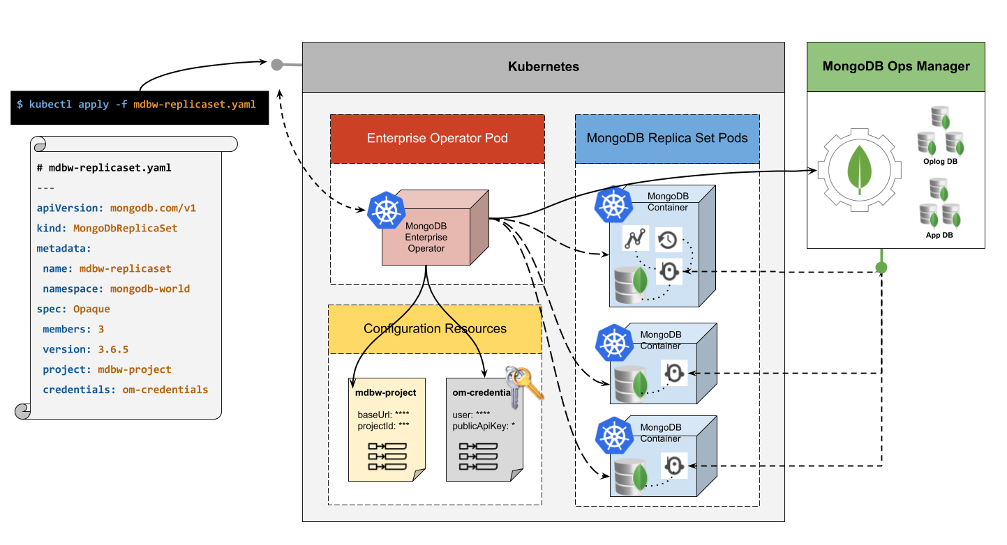 The MongoDB Enterprise Operator for Kubernetes is a MongoDB application-specific controller that extends the Kubernetes API to create, configure, and manage instances of MongoDB deployments on behalf of a Kubernetes user. The operator lets you deploy and manage MongoDB by accessing the Kubernetes API and MongoDB Ops Manager API. It automates common tasks by triggering a series of actions to achieve the desired state. For example, when you create MongoDB Kubernetes resource MongoDbReplicaSet, then the operator
