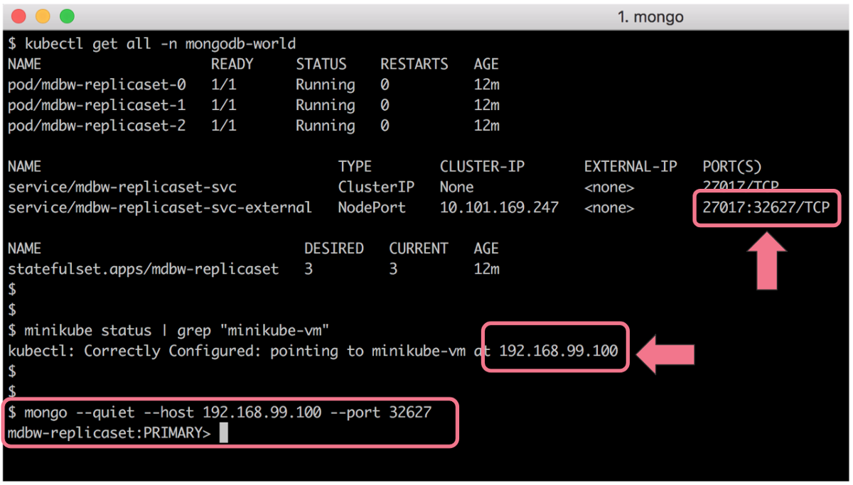 The connectivity to the MongoDB deployment within the Kubernetes cluster is very simple. Here in this example, I am connecting to the interactive terminal of first replica set member and using the mongo shell to connect to localhost.