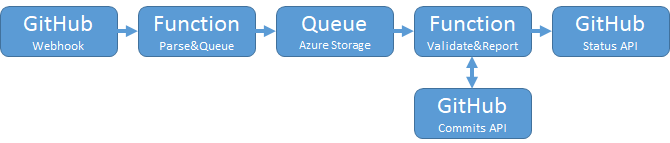 Roughly the flow will be GitHub triggers a webhook call to a function, the function will parse out what’s needed from the GitHub payload and place it on an Azure Storage Queue, the queue will trigger a function that does the validation and reports back status to the pull request using the GitHub rest API.