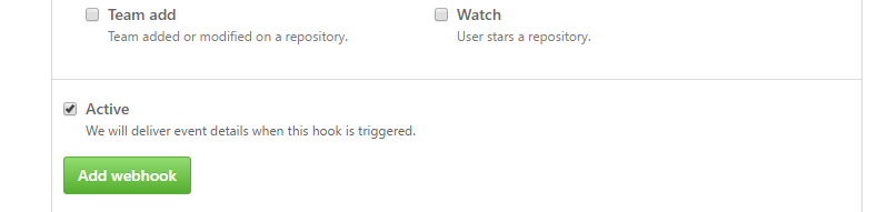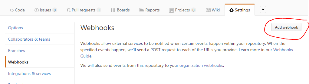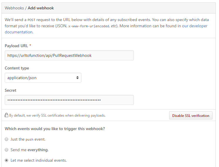 Now we just need to configure GitHub to call our function when a pull request is created or modified. This is done under repository (or organization) settings “Webhooks”->”Add webhook”