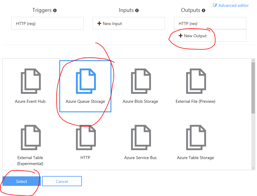 Go to “Integrate” to add a queue output via the portal, click “+ New Output”, in this case we want an Azure Storage Queue