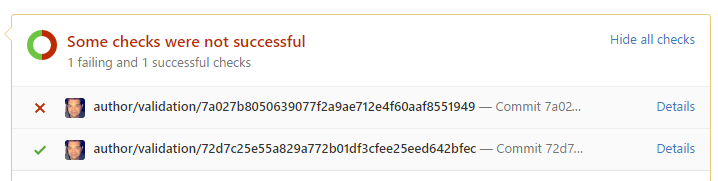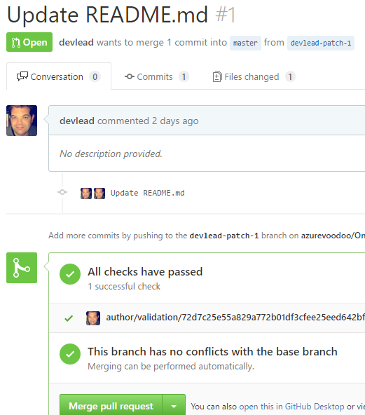 If all goes to plan, you should see that 1 author validation has been performed and as I’m a known GitHub user the test passes and all’s OK.