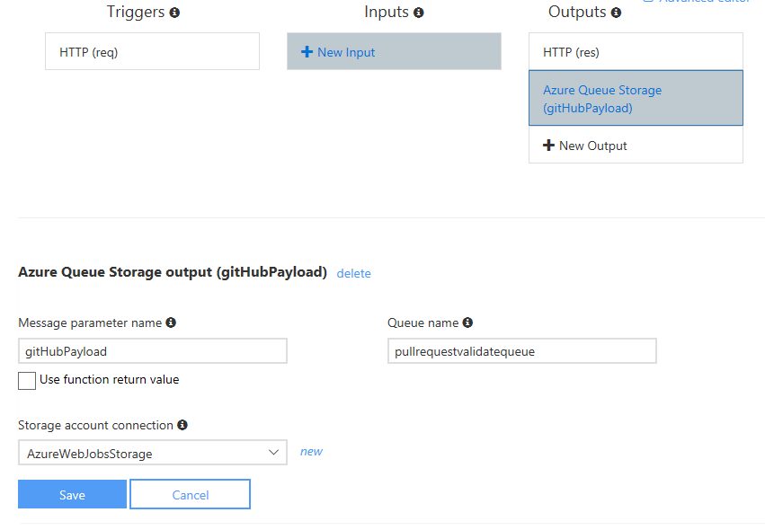 You then give the “queue output” a parameter name which will be the name of the output parameter in your function, then name of the queue to push messages to and last choose the appsetting where your storage queue connection string resides.Hit save and our queue parameter binding is ready.