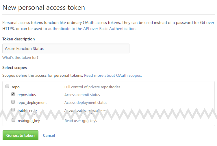 Then click the “Generate Token” button, give the token a description, choose the required access, there’s loads of available permissions, but for this post “repo:status” is the only access needed