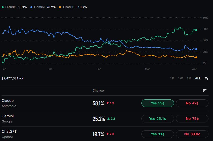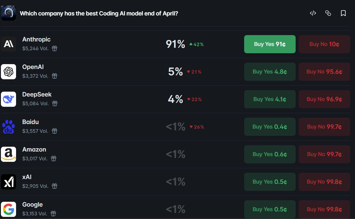 Companies are racing to deliver the best coding AI model, but according to Polymarket voters, it appears to be a lopsided race. Voters believe there is a 91% chance Anthropic will have the best coding AI model by the end of April. Second place is OpenAI with a 5% chance. Third place is DeepSeek with a 4% chance. Then, the rest of the other companies have less than a 1% chance of winning the race.