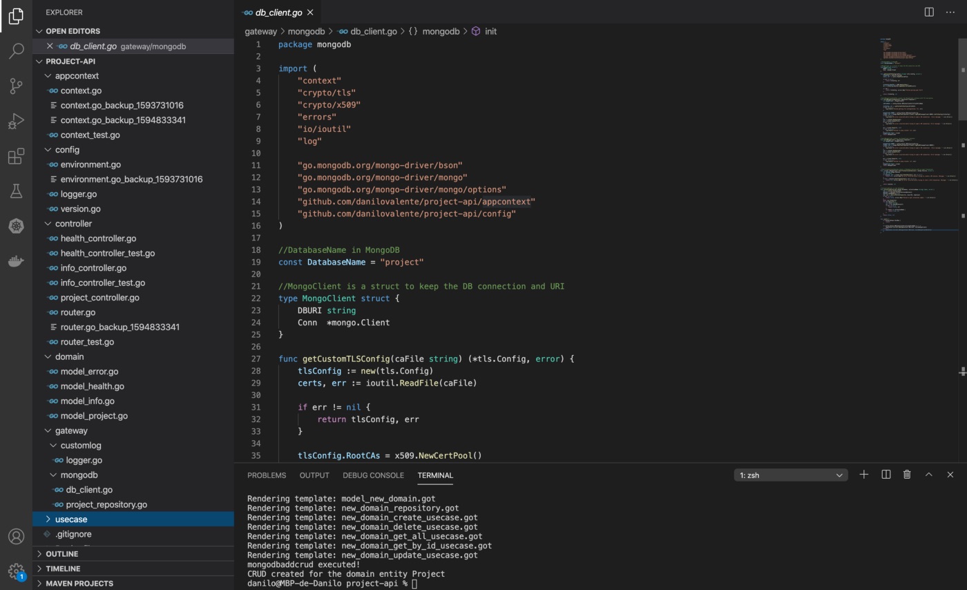 As can be seen with the help of the golangspell help mongodbaddcrud command, the unique expected parameter is the domain entity name, in camel case. In our example the business entity which will be represented is the Project, so that the provided name will be Project.