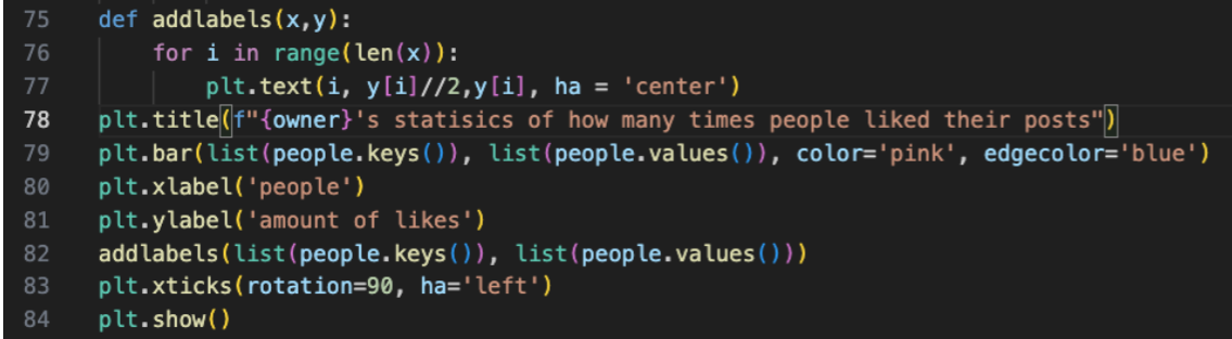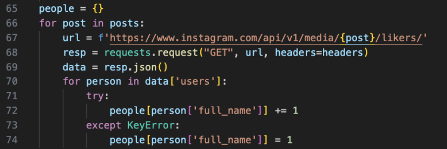 Then repeating the same process in python. Well somewhat similar. The feature of getting how many times a friend liked my total posts is not exactly provided in the obvious way unlike just getting likes and comments. I could just go onto a post and check the like number but in order to find who liked it, and calculating (adding it up) for all posts, is a whole different story.