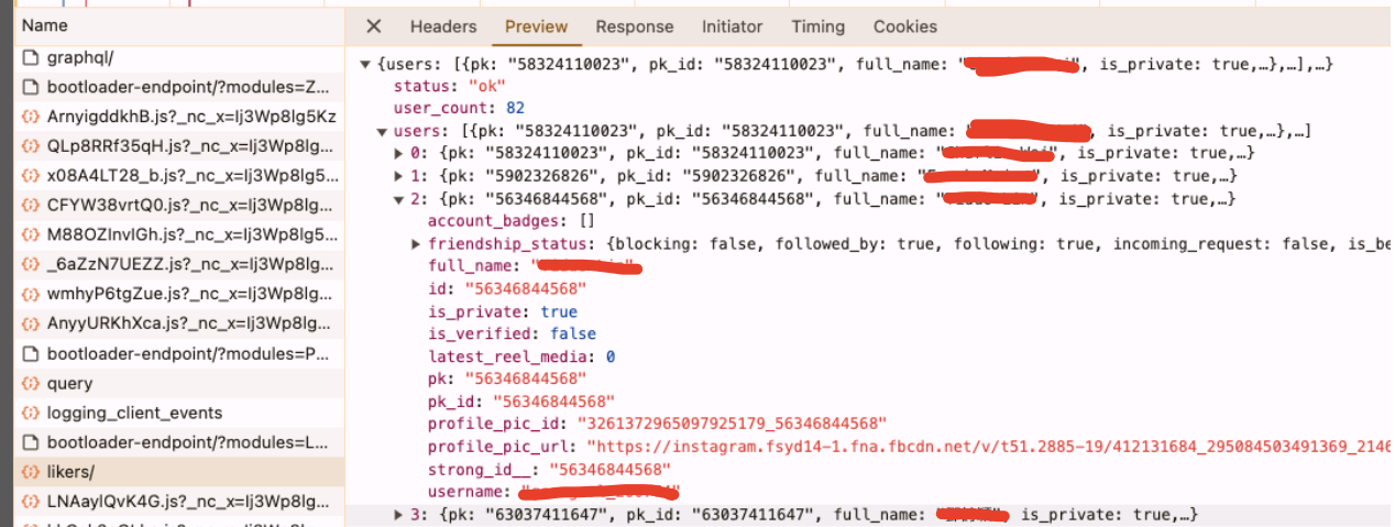 In order to find out which people *specifically* liked my posts, I had to follow the holy grail of data collecting, again. Scrolling through network requests to find out the source of the giant stream of data which powers everything.