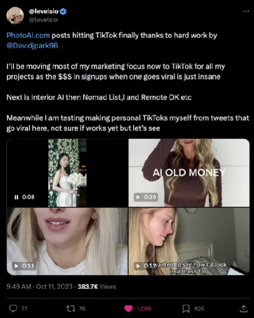 He also mentioned in a podcast that he talked with a TikTok influencer to make posts about PhotoAI (his startup about AI pictures) and MRR went from $12k to $40k from that alone.
