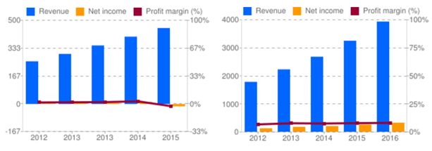 The analysis is that NDLS didn’t train new store management well and customer experience wasn’t where it needed to be. Same store sales languished. The roll out slowed. The stock slid. And slid. And slid. When evaluating the performance of a company that is in a Growth phase, if they don’t grow but their competitors do, there is something wrong with the company. If their competitors don’t grow either, there is something wrong with the market. In the case of NDLS, they are in a saturated market that was growing slowly, and the couldn’t differentiate their stores sufficiently. They grew revenue by opening new stores, but profit margins were very low and declining. Contrast that to ULTA, which maintains healthy net margins as they grow. NDLS is not healthy.