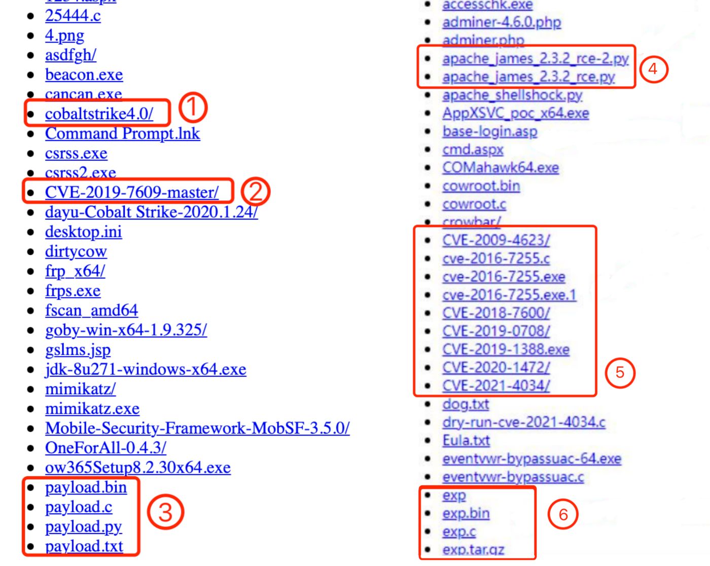 Our analysis revealed multiple Cobalt Strike controllers and attacker-operated machines that publicly exposed malicious binaries, exploitation scripts, payloads, and scan results. In certain instances, external actors had already traversed these directories and downloaded entire toolkits — indicating the presence of “hunters” actively targeting hacker workstations to steal their tools and intelligence.