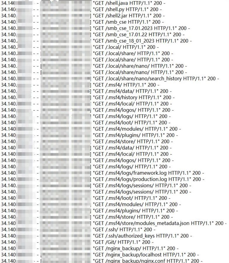 Analysis of this log revealed multiple suspicious IP addresses, including 34.140.*.*, which performed recursive downloads across all directories. These were not search engine crawlers but deliberate actors — likely “hunters” — collecting every accessible file.