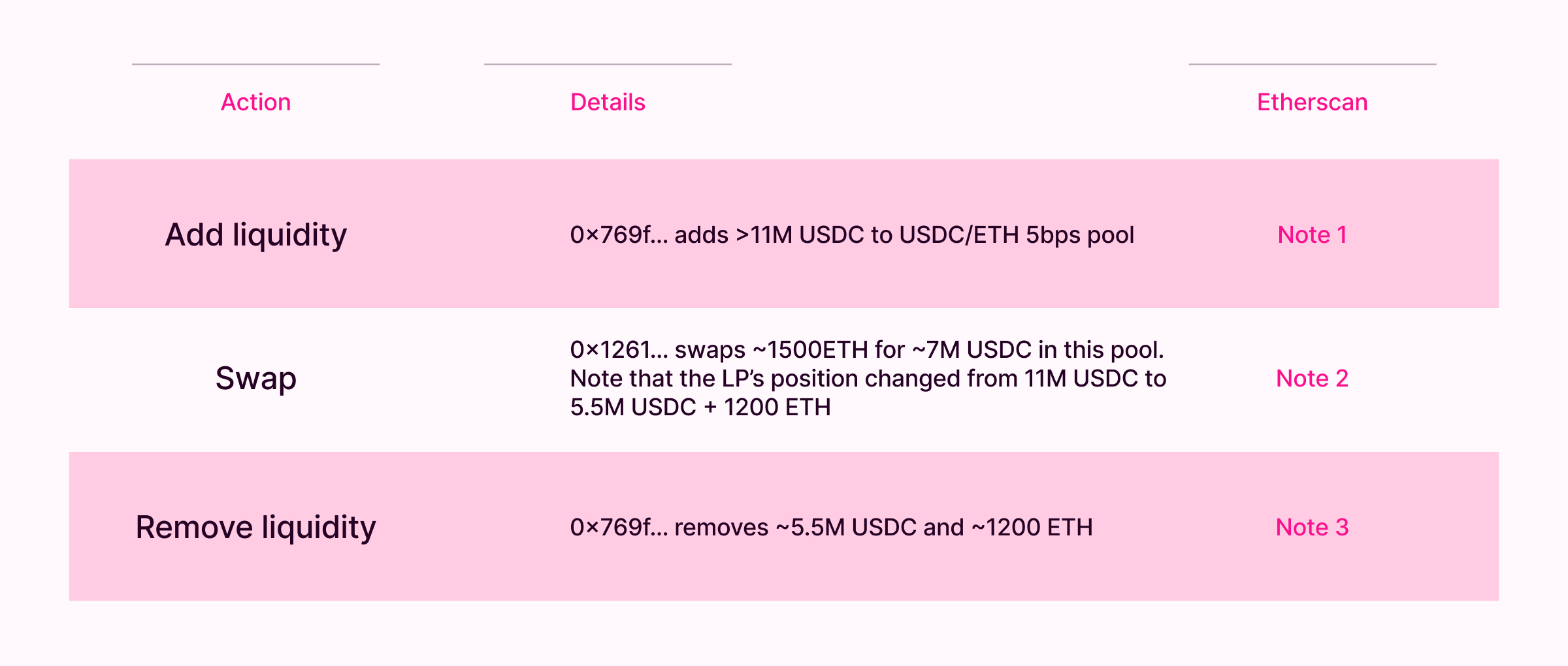After the swap, LP places a withdrawal transaction. This transaction removes all provided liquidity with collected fees. Even if this transaction is executed after the swap, it is still in the same block.