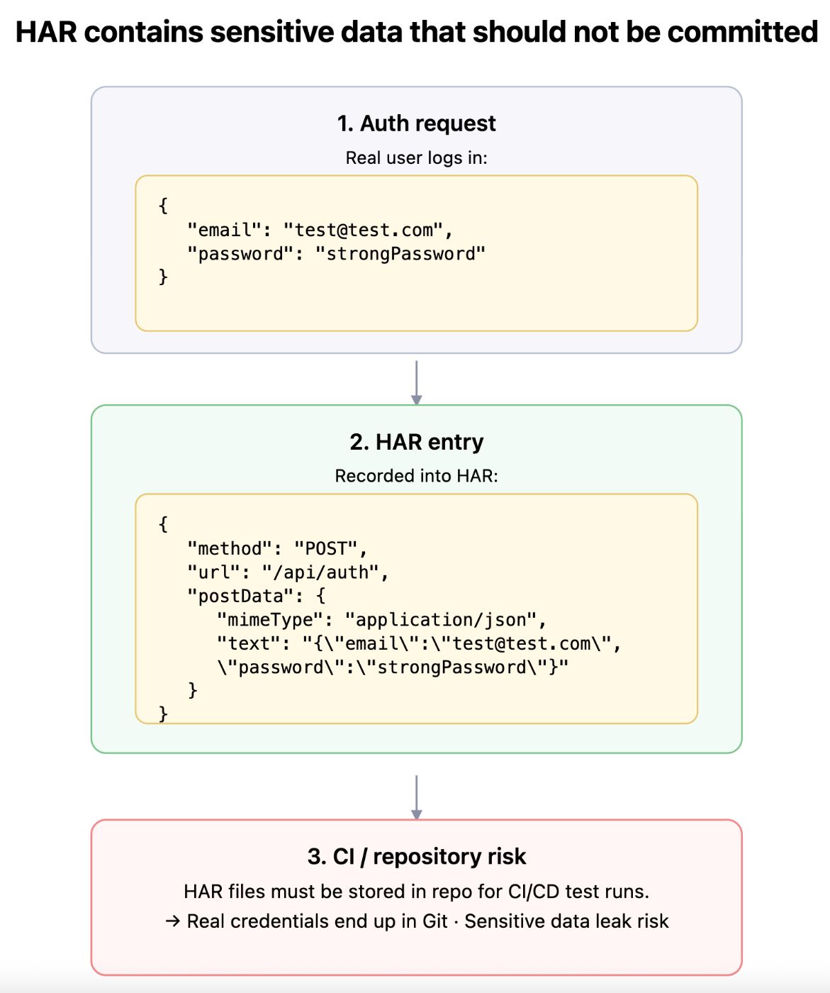 A recorded HAR file is a snapshot of network requests made while hitting the real backend during test execution. As a result, the file may contain dynamic data, user IDs in URLs, and sensitive information (auth tokens, emails, etc.).