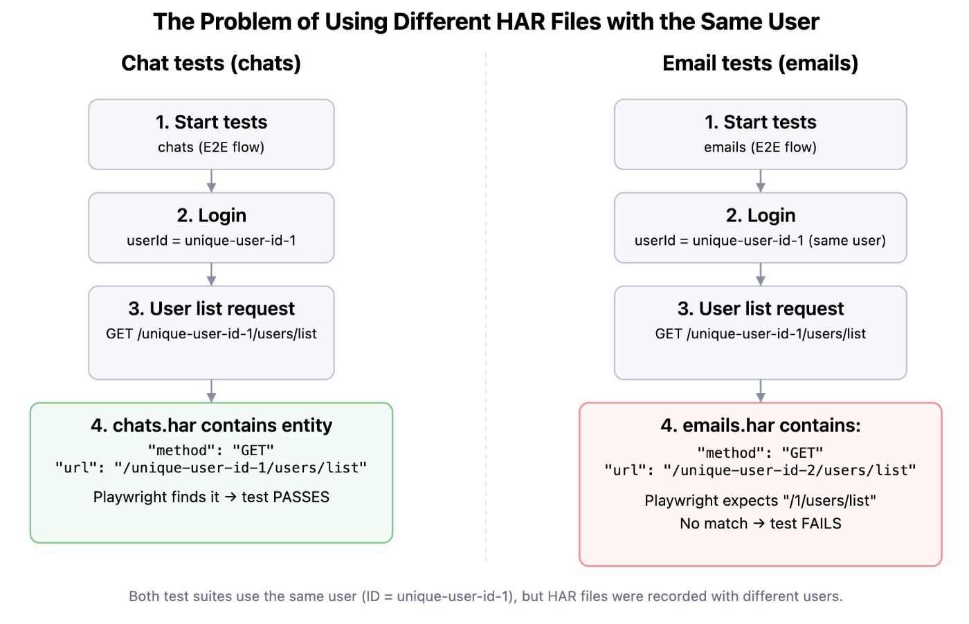 If we run all tests logged in as the user with ID unique-user-id-1, Playwright won’t be able to find the needed entity in emails.har when running the email page tests, because the endpoint GET /unique-user-id-2/users/list was recorded for user unique-user-id-2, while Playwright will look for /unique-user-id-1/users/list.