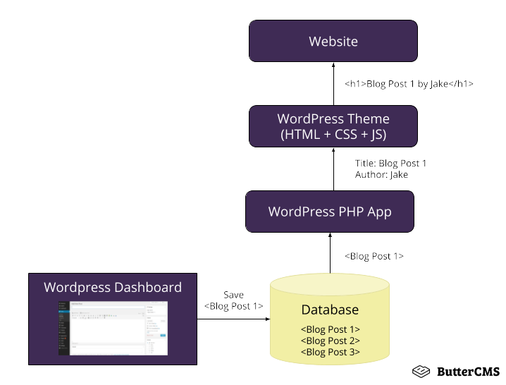 - The Wordpress PHP application passes that blog post content (title, author, body, published date, etc) into the Wordpress Theme