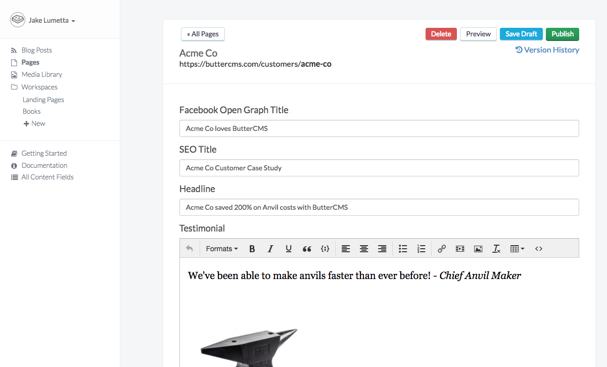{ "data": { "slug": "acme-co-case-study", "fields": { "seo_title": "Acme Co Customer Case Study", "seo_description": "Acme Co saved 200% on Anvil costs with ButterCMS", "title": "Acme Co loves ButterCMS", "body": "<p>We've been able to make anvils faster than ever before! - Chief Anvil Maker</p>" } }
