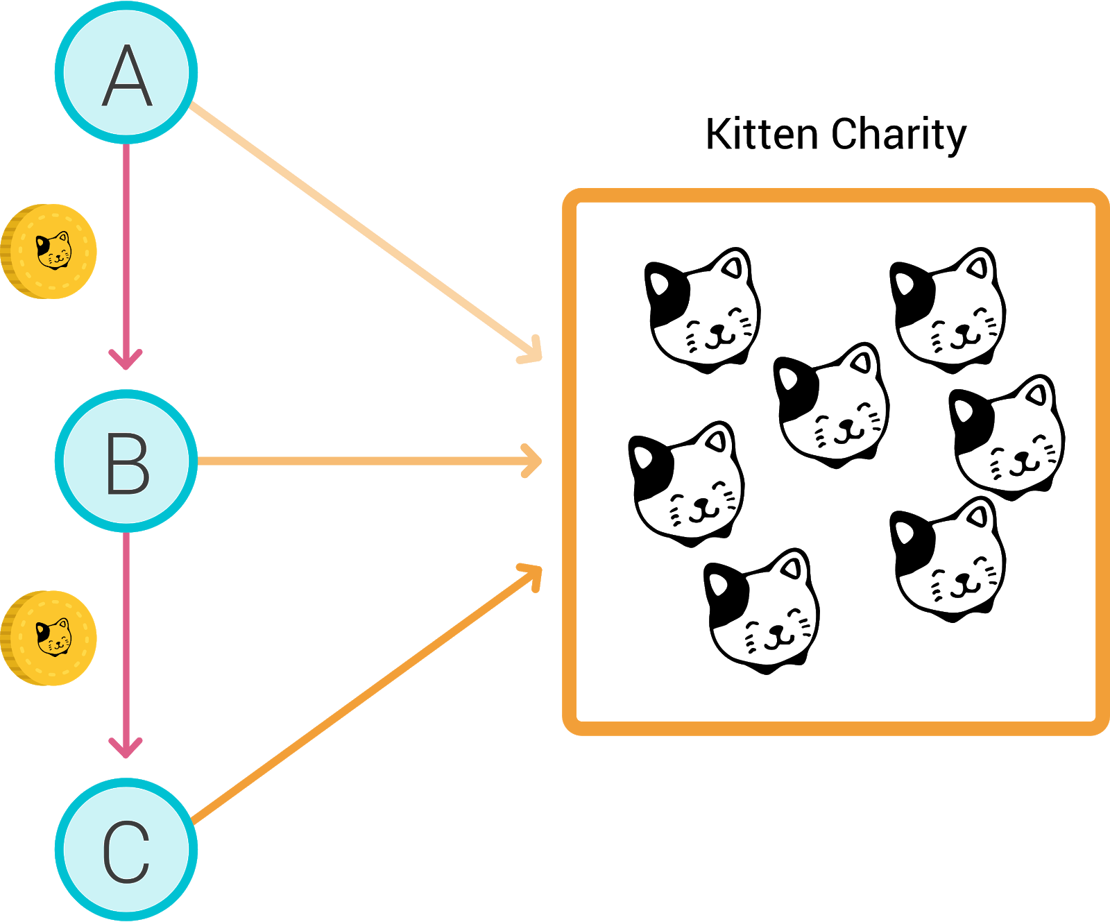 - Bob can pass the kittyCent to Carol and pledge to match the final donation. If Carol redeems the KittyCent by donating $10, both Alice and Bob will match Carol, generating a total of $30.