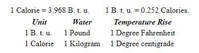 British Thermal Unit —The quantitative measure of heat is the British thermal unit, ordinarily written B. t. u. This is the quantity of heat required to raise the temperature of one pound of pure water one degree at 62 degrees Fahrenheit; that is, from 62 degrees to 63 degrees. In the metric system this unit is the calorie and is the heat necessary to raise the temperature of one kilogram of pure water from 15 degrees to 16 degrees centigrade. These two definitions lead to a discrepancy of 0.03 of 1 per cent, which is insignificant for engineering purposes, and in the following the B. t. u. is taken with this discrepancy ignored. The discrepancy is due to the fact that there is a slight difference in the specific heat of water at 15 degrees centigrade and 62 degrees Fahrenheit. The two units may be compared thus: