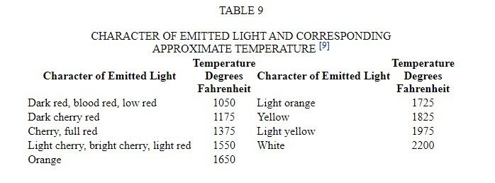 Determination of Temperature from Character of Emitted Light —As a further means of determining approximately the temperature of a furnace, Table 9 , compiled by Messrs. White & Taylor, may be of service. The color at a given temperature is approximately the same for all kinds of combustibles under similar conditions.