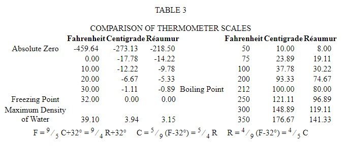 By reason of the uniform expansion of mercury and its great sensitiveness to heat, it is the fluid most commonly used in the construction of thermometers. In all thermometers the freezing point and the boiling point of water, under mean or average atmospheric pressure at sea level, are assumed as two fixed points, but the division of the scale between these two points varies in different countries. The freezing point is determined by the use of melting ice and for this reason is often called the melting point. There are in use three thermometer scales known as the Fahrenheit, the Centigrade or Celsius, and the Réaumur. As shown in Fig. 11, in the Fahrenheit scale, the space between the two fixed points is divided into 180 parts; the boiling point is marked 212, and the freezing point is marked 32, and zero is a temperature which, at the time this thermometer was invented, was incorrectly imagined to be the lowest temperature attainable. In the centigrade and the Réaumur scales, the distance between the two fixed points is divided into 100 and 80 parts, respectively. In each of these two scales the freezing point is marked zero, and the boiling point is marked 100 in the centigrade and 80 in the Réaumur. Each of the 180, 100 or 80 divisions in the respective thermometers is called a degree.