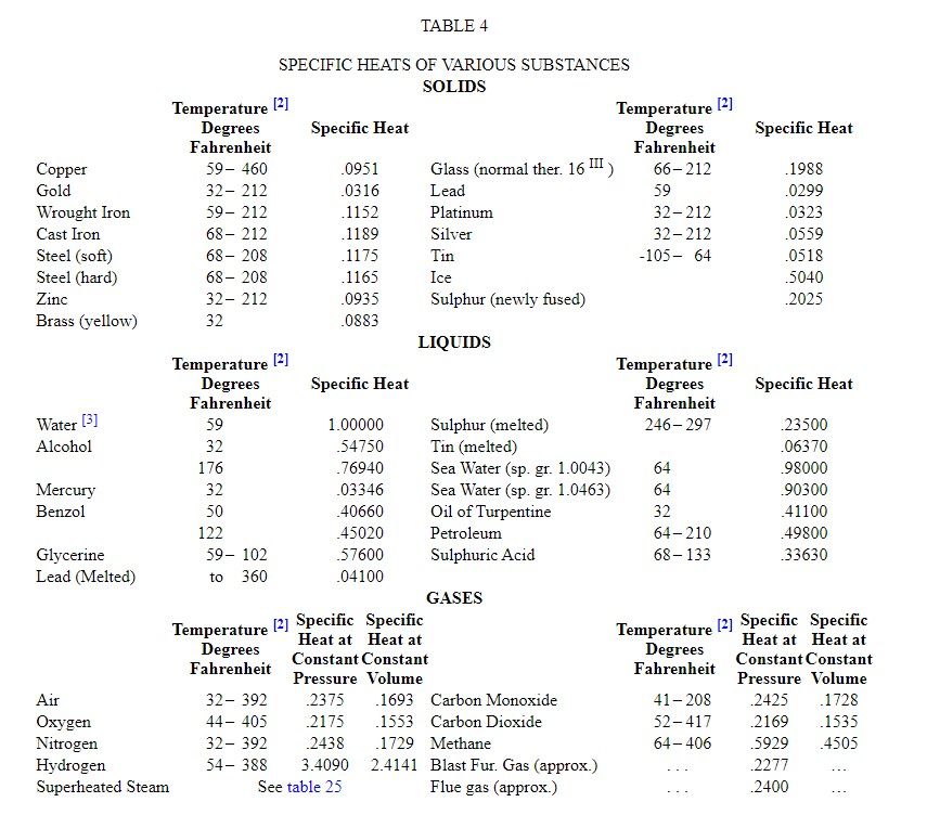 The specific heats of various solids, liquids and gases are given in Table 4 .