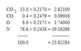 The specific heat of a mixture of gases is obtained by multiplying the specific heat of each constituent gas by the percentage by weight of that gas in the mixture, and dividing the sum of the products by 100. The specific heat of a gas whose composition by weight is CO 2 , 13 per cent; CO, 0.4 per cent; O, 8 per cent; N, 78.6 per cent, is found as follows:
