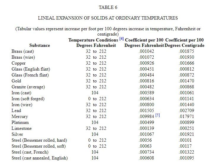 Linear Expansion of Substances by Heat —To find the increase in the length of a bar of any material due to an increase of temperature, multiply the number of degrees of increase in temperature by the coefficient of expansion for one degree and by the length of the bar. Where the coefficient of expansion is given for 100 degrees, as in Table 6 , the result should be divided by 100. The expansion of metals per one degree rise of temperature increases slightly as high temperatures are reached, but for all practical purposes it may be assumed to be constant for a given metal.