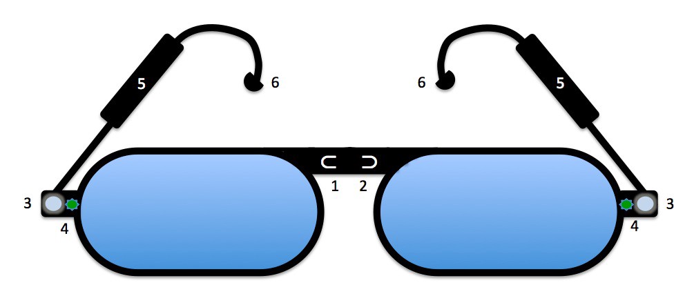 I am amazed, now that headphones are at high fashion ebb, that we don’t hear much about binaural recording, and no smartphones or tablets feature it yet. Maybe Snapchat (or some competitor) can change that. In the meantime, find some binaural sound recordings and listen to them, on headphones. They are much different than conventional stereo recordings, because only two microphones are used, typically located on a bust — a mannequin head — in the positions of human ears. That way they record what a person hears, rather than what a sound engineer puts together with a mixer. The effect is the aural equivalent of 3-D images: the whole “sound stage” is very much a you-are-there-360°-on-all-axes experience. In other words, better than 3D. With my design here, you can make your own binaural recordings, thanks to binaural microphones over the ears (#5). Lights on the tynes will also tell others whether or not you are recording: another example of privacy by design.