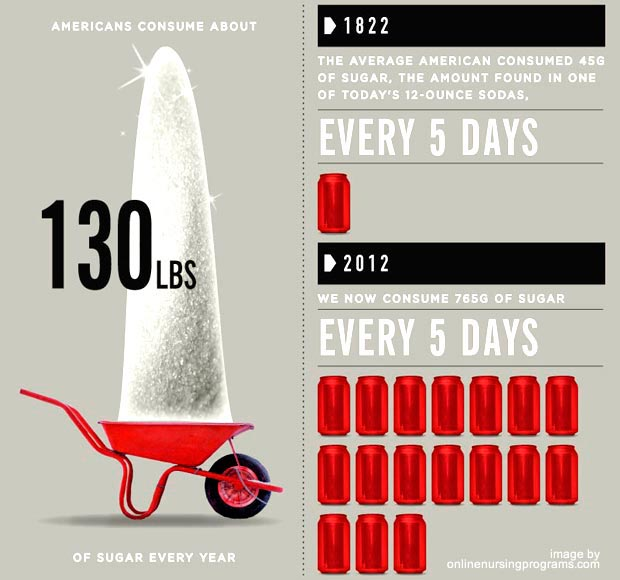 The average American eats 130 pounds of sugar per year.