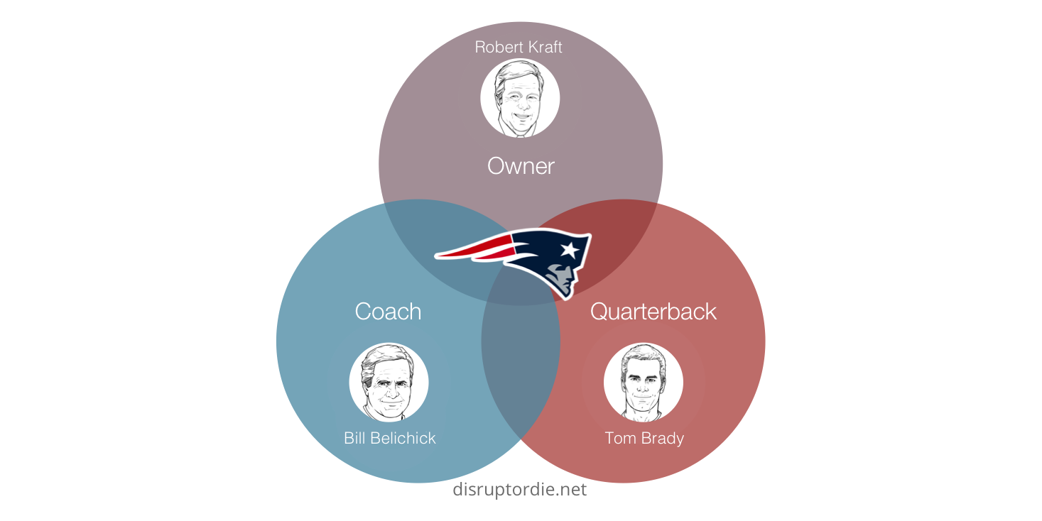 Robert’s insight instantly resonated with me. Leadership is influenced by innumerable factors, but the key is to understand the highest priority elements. Here’s a diagram of the Patriot’s Football Trinity: