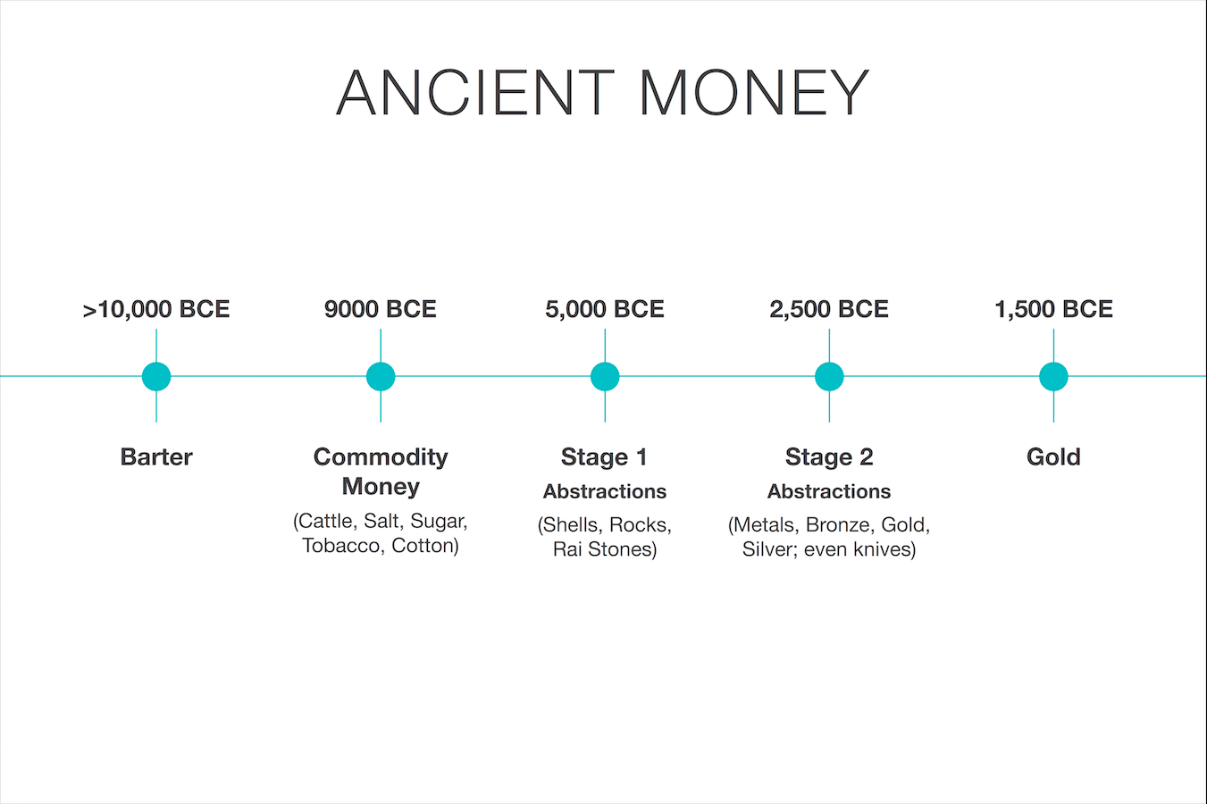 We went from barter, to commodity money like cows & spices, to initial abstractions like shells to better abstractions like metals such as bronze, then silver then gold.
